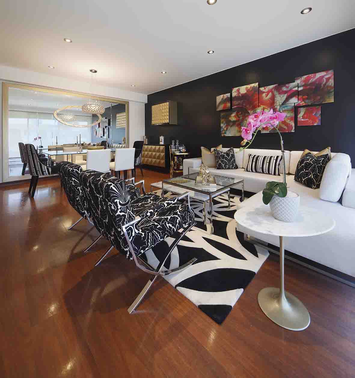 Se logró el dramatismo con una pared pintada en negro satinado haciendo resaltar los accesorios dorados que se apoyan en ella y sobre todo ayuda a enmarcar la bella obra de arte de Antonio Zegarra, que en este caso se convierte en el punto focal de la decoración aportándonos el color con este diseño de espejos faceteados.