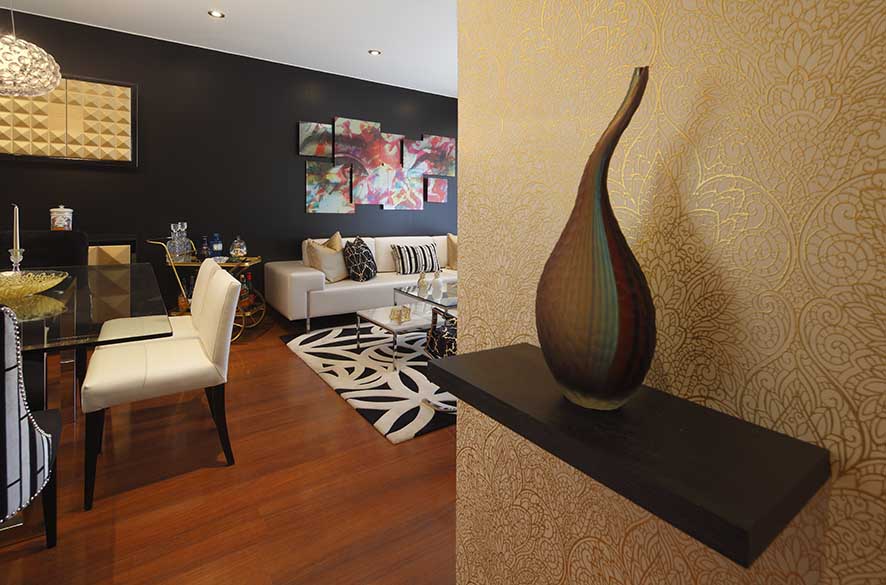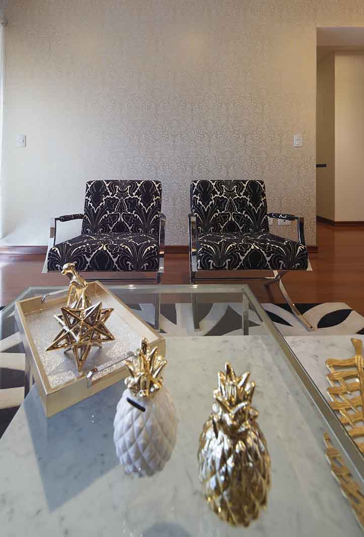 Para darle este aire chic, cumplen un papel muy importante los accesorios como el papel tapiz que viste toda una pared con detalles brocados en dorado champagne, la alfombra de diseño exclusivo para este ambiente, los adornos cuidadosamente seleccionados.