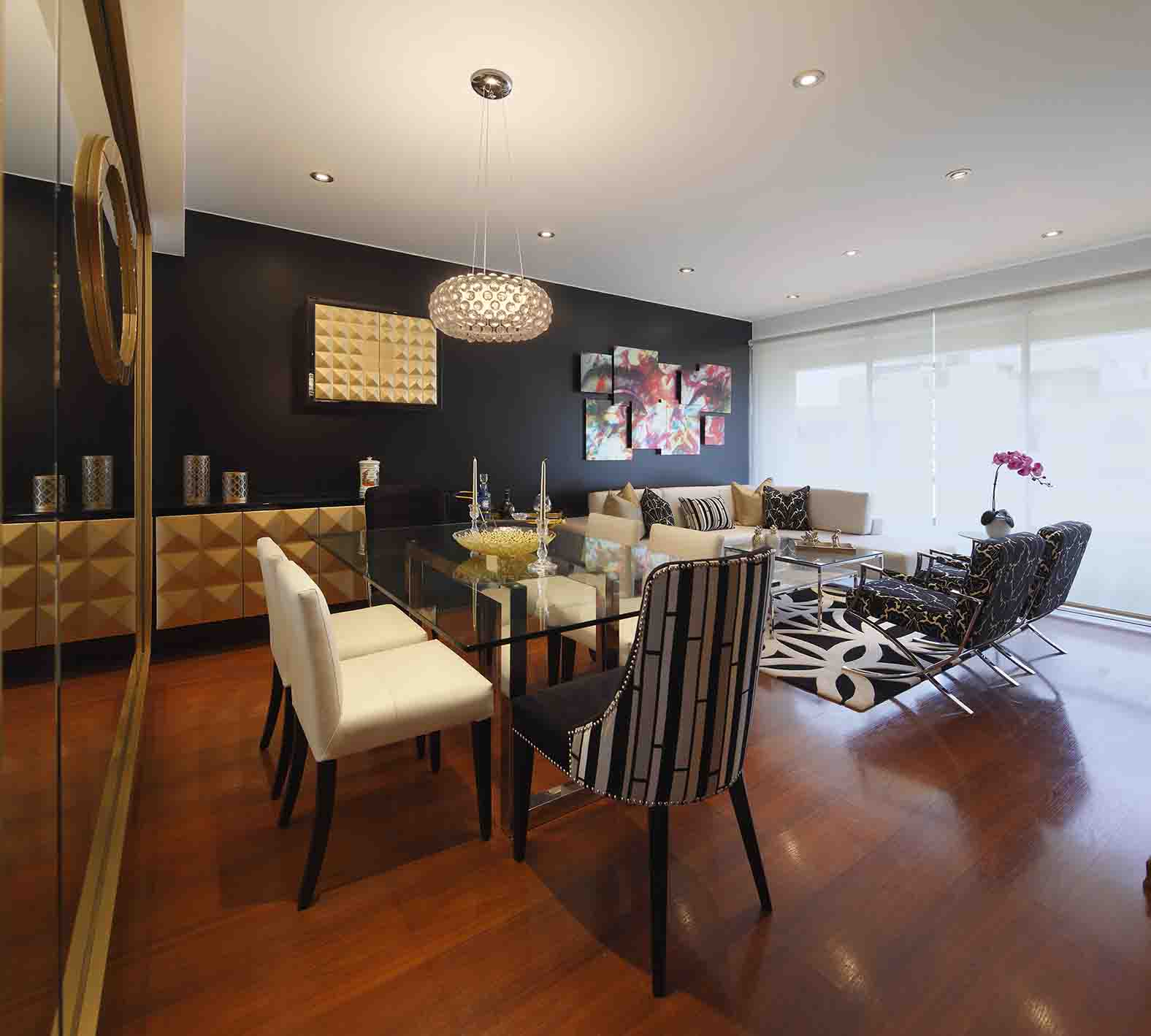 En el comedor se optimizo cada M2 sin perder el estilo y elegancia amarrando con la decoración de la sala; por ello se diseñó un mueble multifuncional que nos sirve de consola – aparador – bargueño, lacado en negro con detalle en alto relieve piramidal en dorado, que nos crea toda una piel sobre el tabique negro, haciendo contraste con el espejo de pared a pared con un sobre marco elíptico en oro para romper con todo el mobiliario lineal utilizado; en este caso el espejo es un recurso muy importante para dar la sensación de amplitud y luminosidad. El toque en la iluminación lo da la luminaria suspendida.