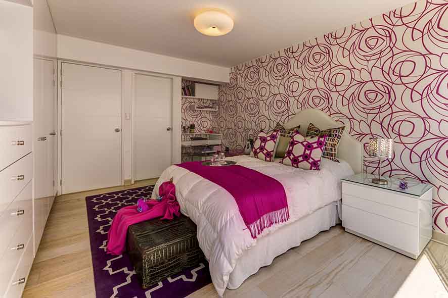 El punto de partida para este dormitorio de la hija fue la elección del papel tapiz, un print de flores fresas nos ofrece el telón de fondo, sobre el cual se apoya una romántica cabecera con un tapiz claro pero resistente en vinil; una mesa de noche sobria en blanco; prácticos cubos móviles con tapa para guardar algunos juguetes, accesorios deportivos y zapatos; y un baúl Vintage al pie de cama, son los elementos complementarios, que juegan muy bien con los coloridos cojines, la manta, los adornos y la alfombra uva con hueso en patrón geométrico.